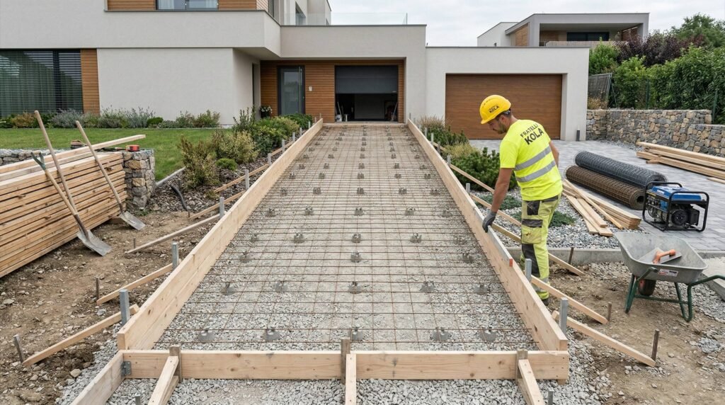 ● Didascalia: Preparazione del sottofondo con cassaforma e armatura correttamente posata per garantire stabilità e durabilità della rampa.