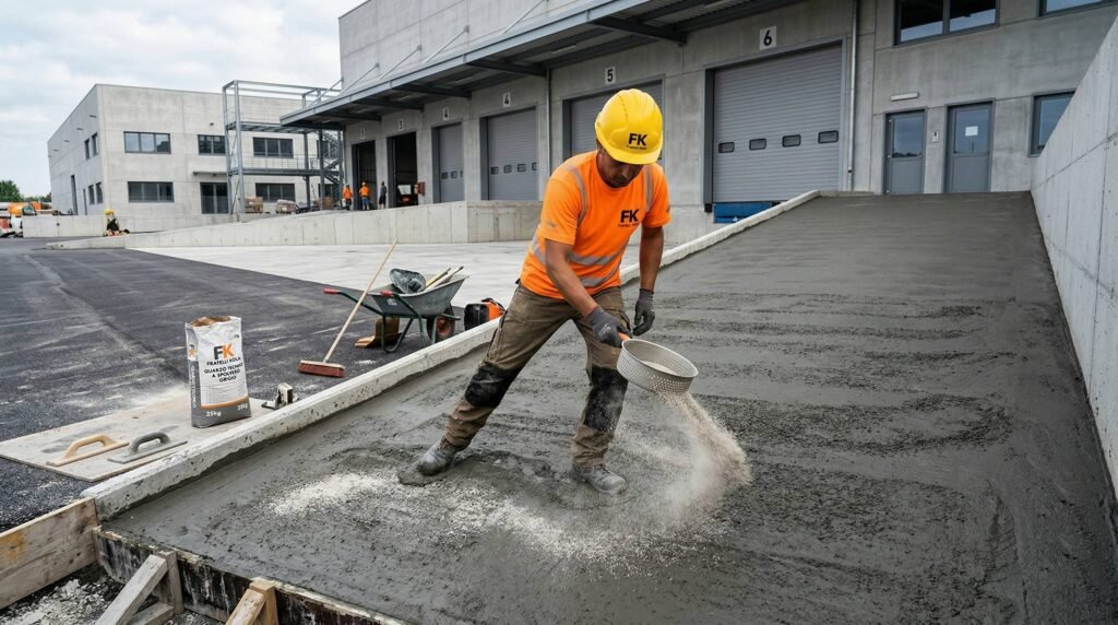 ● Testo ALT: Operaio che applica quarzo tecnico a spolvero sul calcestruzzo fresco durante la realizzazione di una rampa antiscivolo.